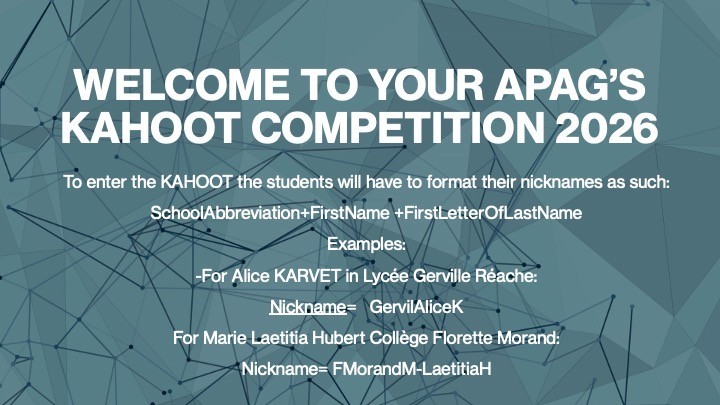 A.P.A.G sincerely thanks you once again for your support in registering your students for our three major usual events: Kahoot – Middle Schools, Kahoot – High Schools, and the Great Debate Challenge, held as part of the Languages Week La Semaine des Langues